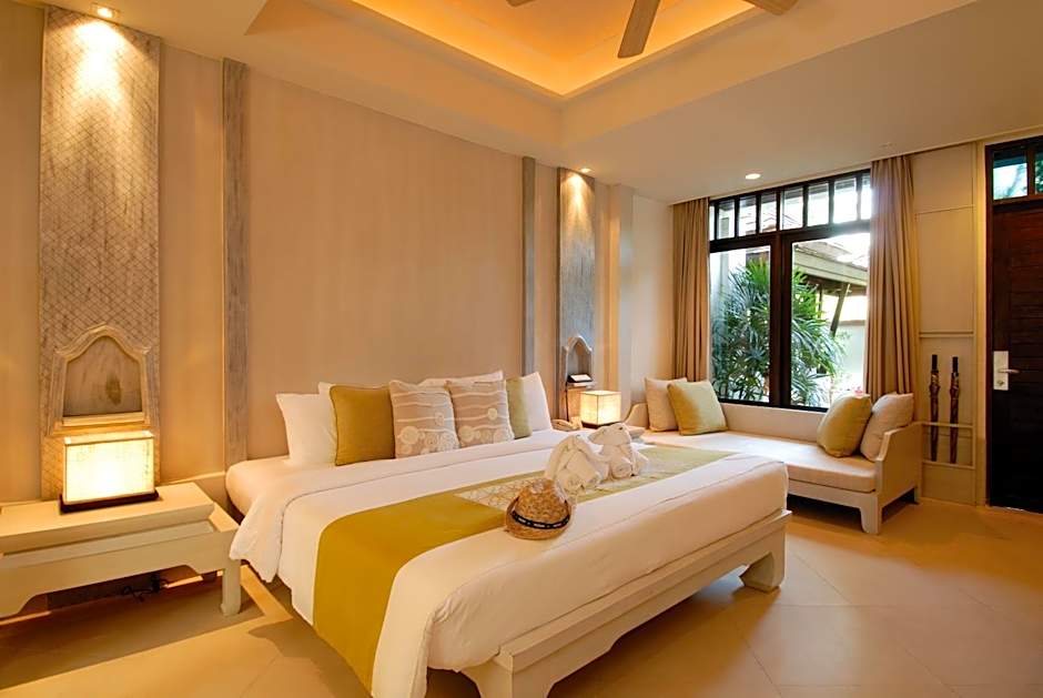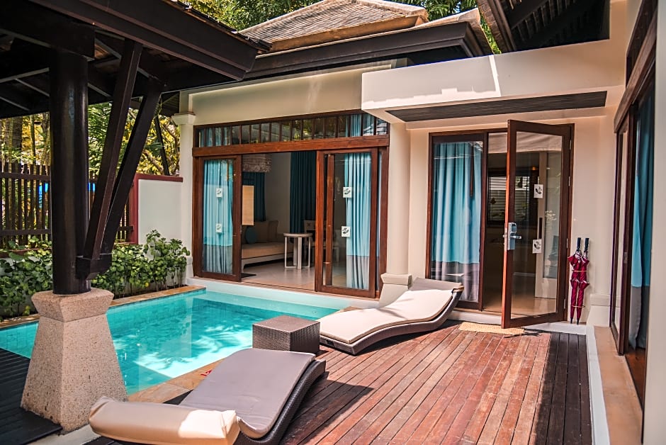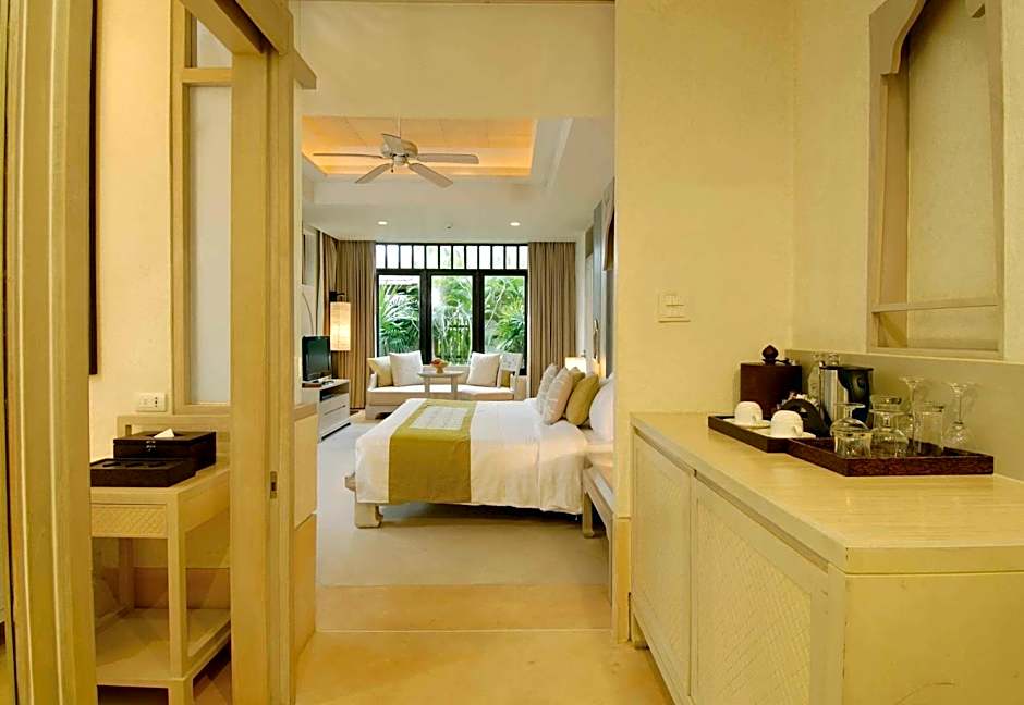 The villa features a large outdoor terrace with a private pool, outdoor shower and generous bath areas with twin vanities. It also has a separate spacious living room that converts to a second bedroom.